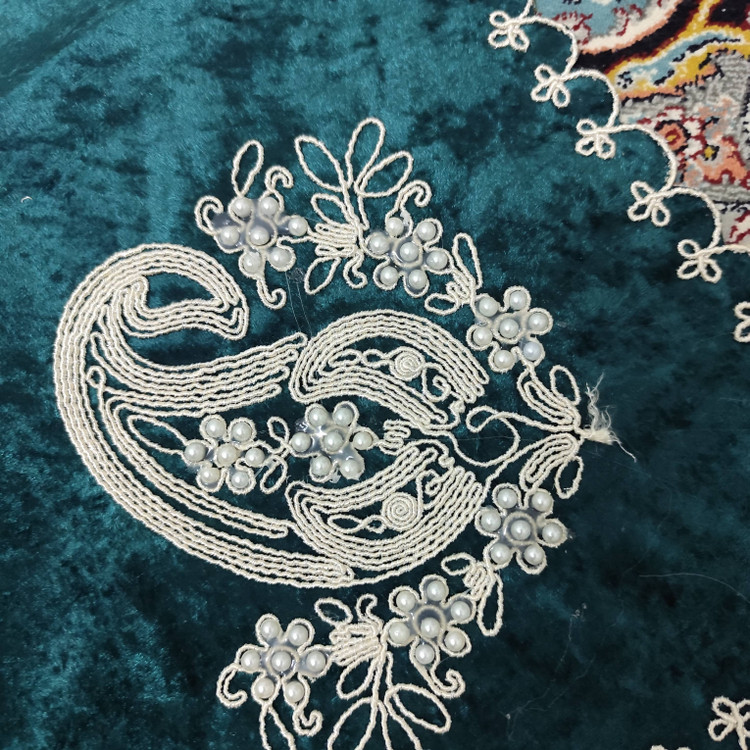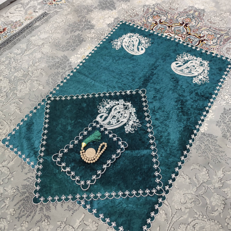 سجاده مخمل سبزآبی سهتکه مرواریدی مدل گلدوزی لوکس | خرید مستقیم از تولیدکننده