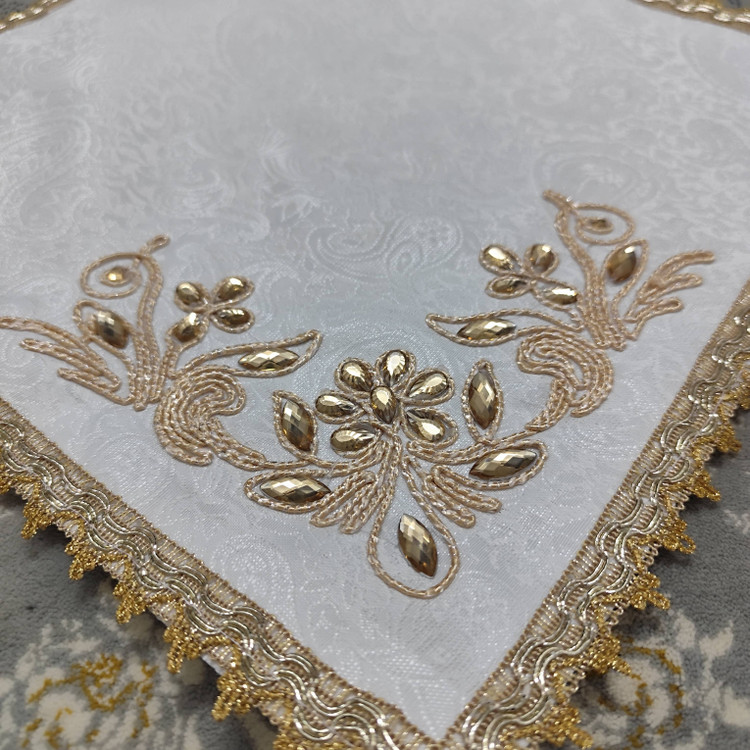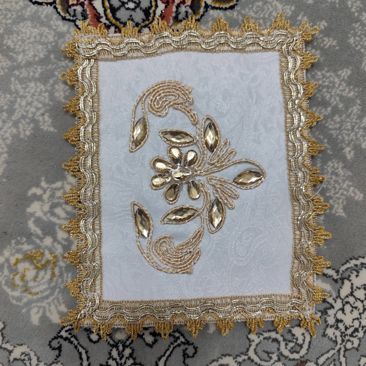 A luxurious white Termeh prayer mat featuring golden lace and rhinestone decoration.