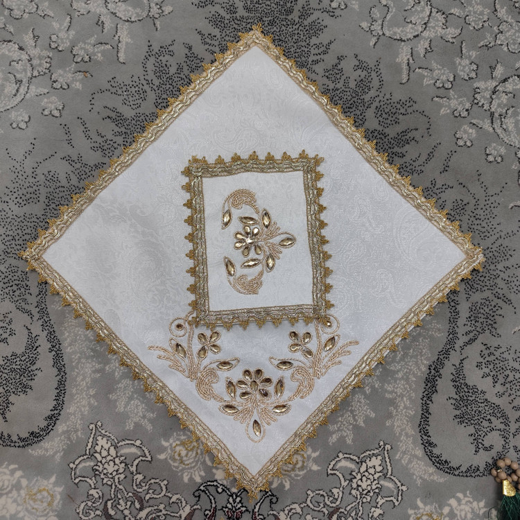 White Termeh Prayer Mat with Gold Embroidery & Rhinestones | Elegant & Washable