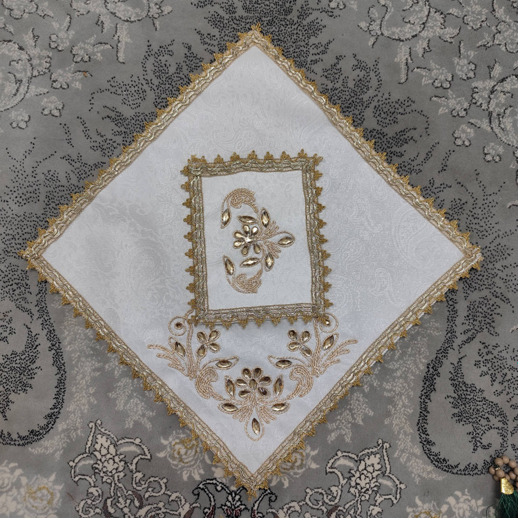 White Termeh Prayer Mat with Gold Embroidery & Rhinestones | 40 cm | Luxury Design