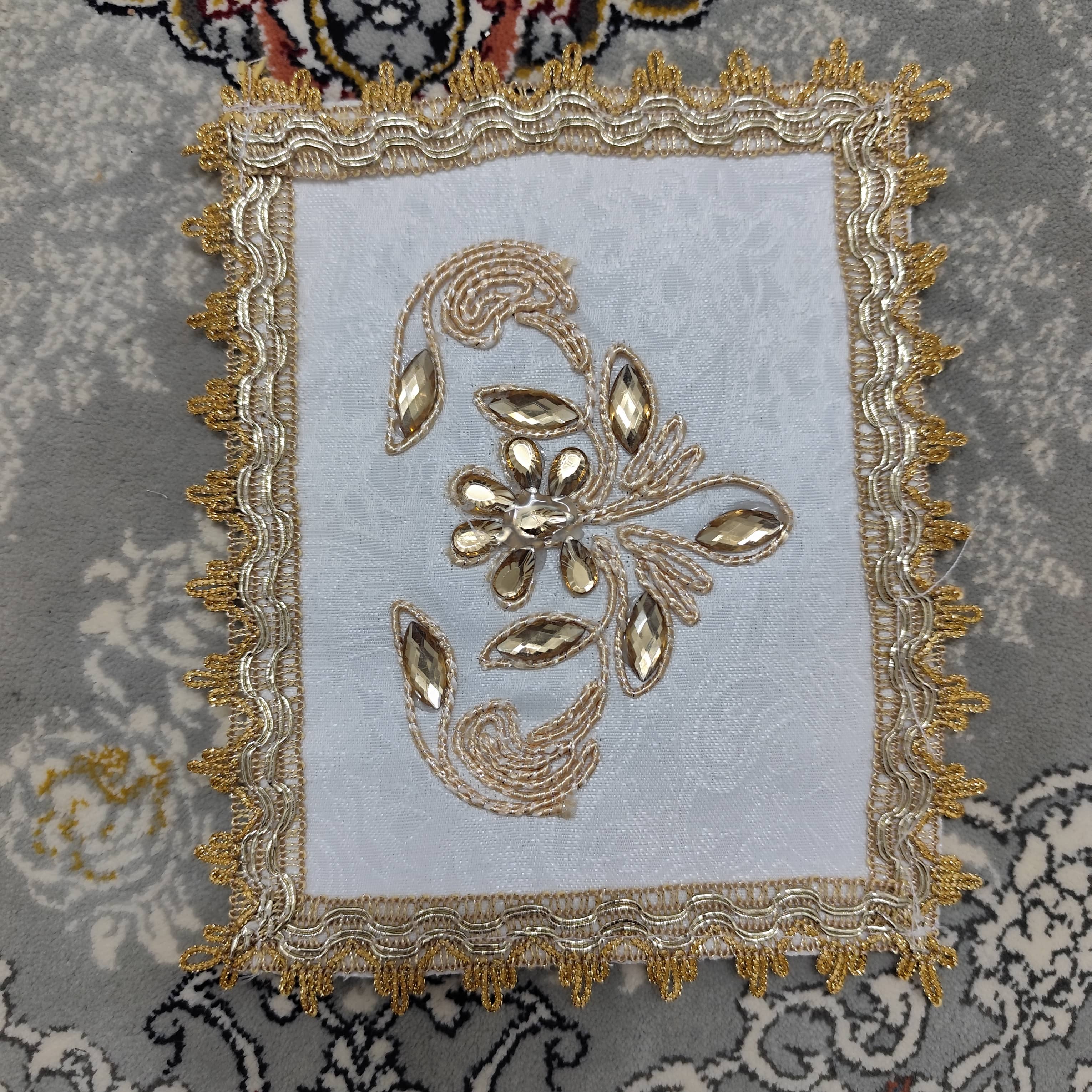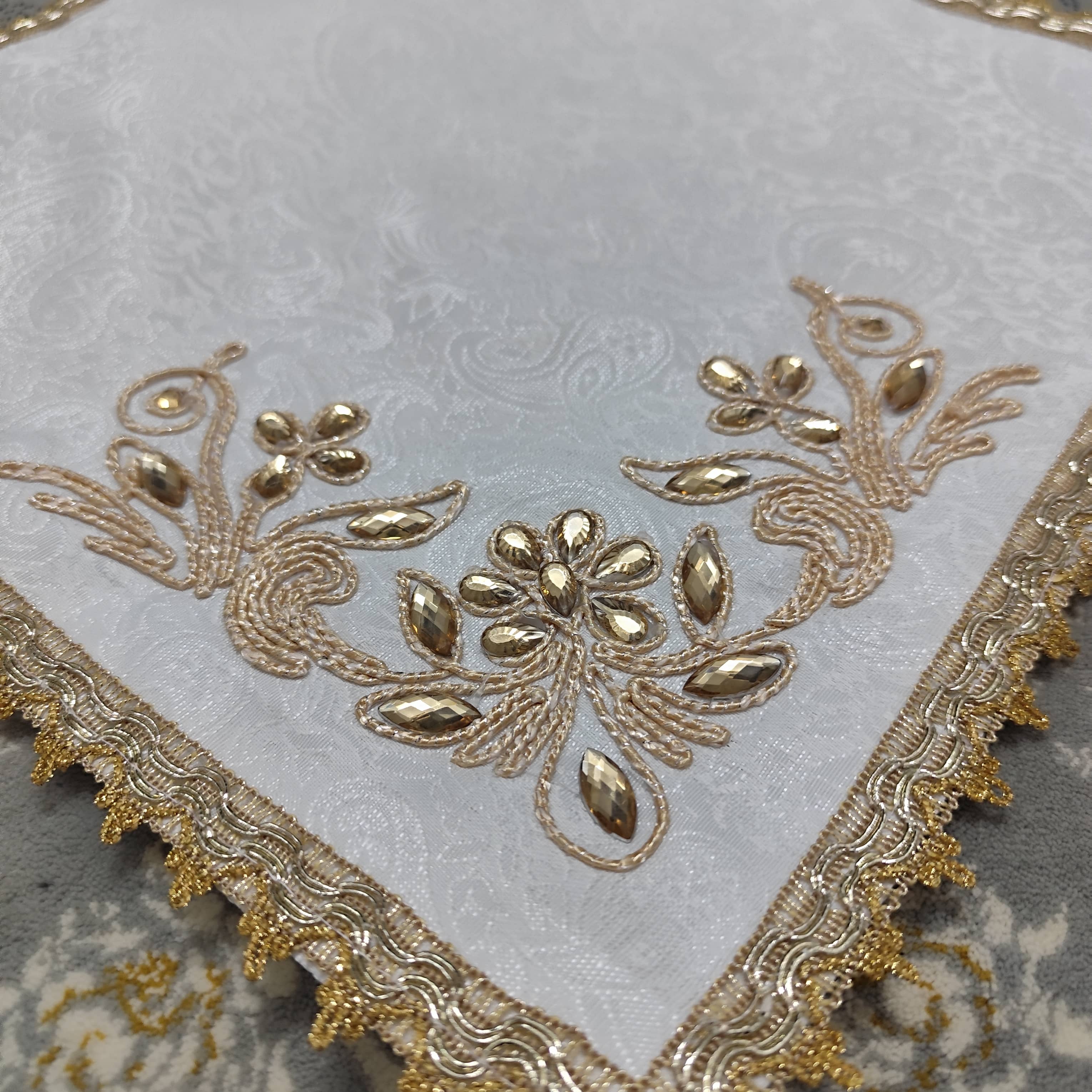White Termeh Prayer Mat with Gold Embroidery & Rhinestones | 40 cm | Luxury Design
