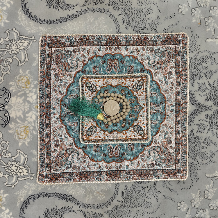 جانماز خاتم دو‌تکه فیروزه‌ای | آستر‌دار و یراق‌دوزی‌شده | ۳۸ سانتی‌متر | کیفیت ممتاز