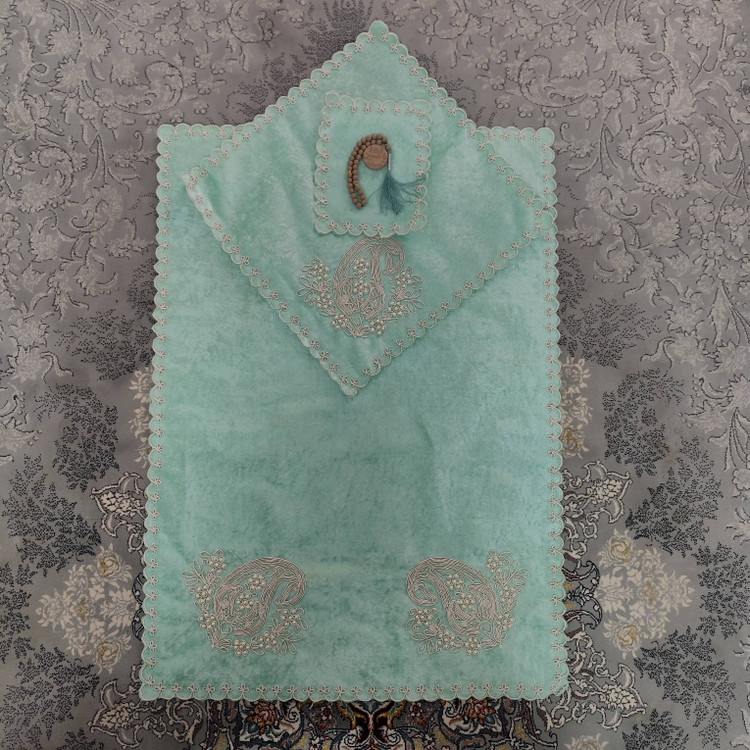 سجاده مخمل سهتکه سبز پستهای | استردار، قابل شستوشو، طرح نفیس