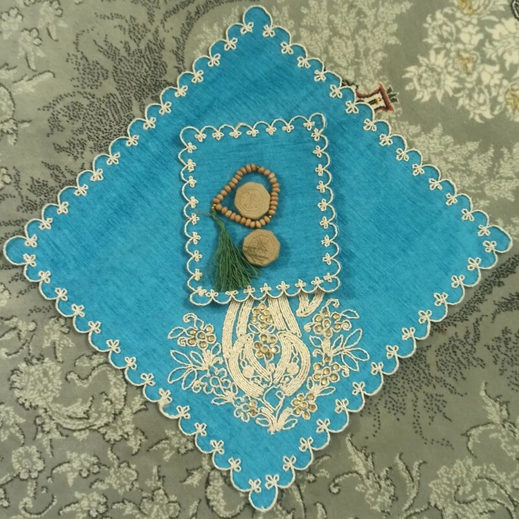 جانمازمخمل ابی اسمانی نگین دار38سانتیمتری دوتکه