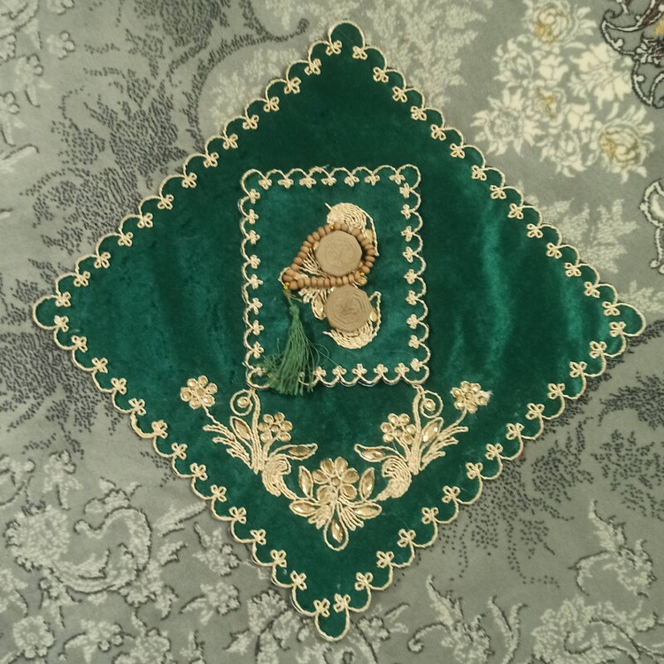 جانماز مخمل نگین دار با حاشیه دوزی و به رنگ سبز یشمی در اندازه 38در38سانتیمتر